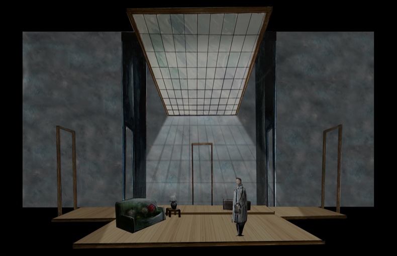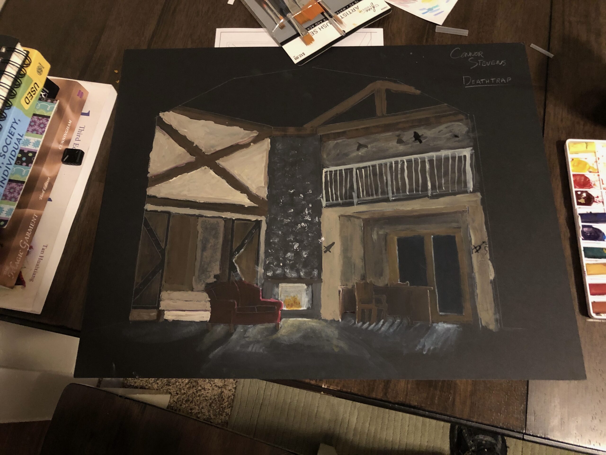After designing the set, I used gouache on black project board to create a rendering for a pre show look.