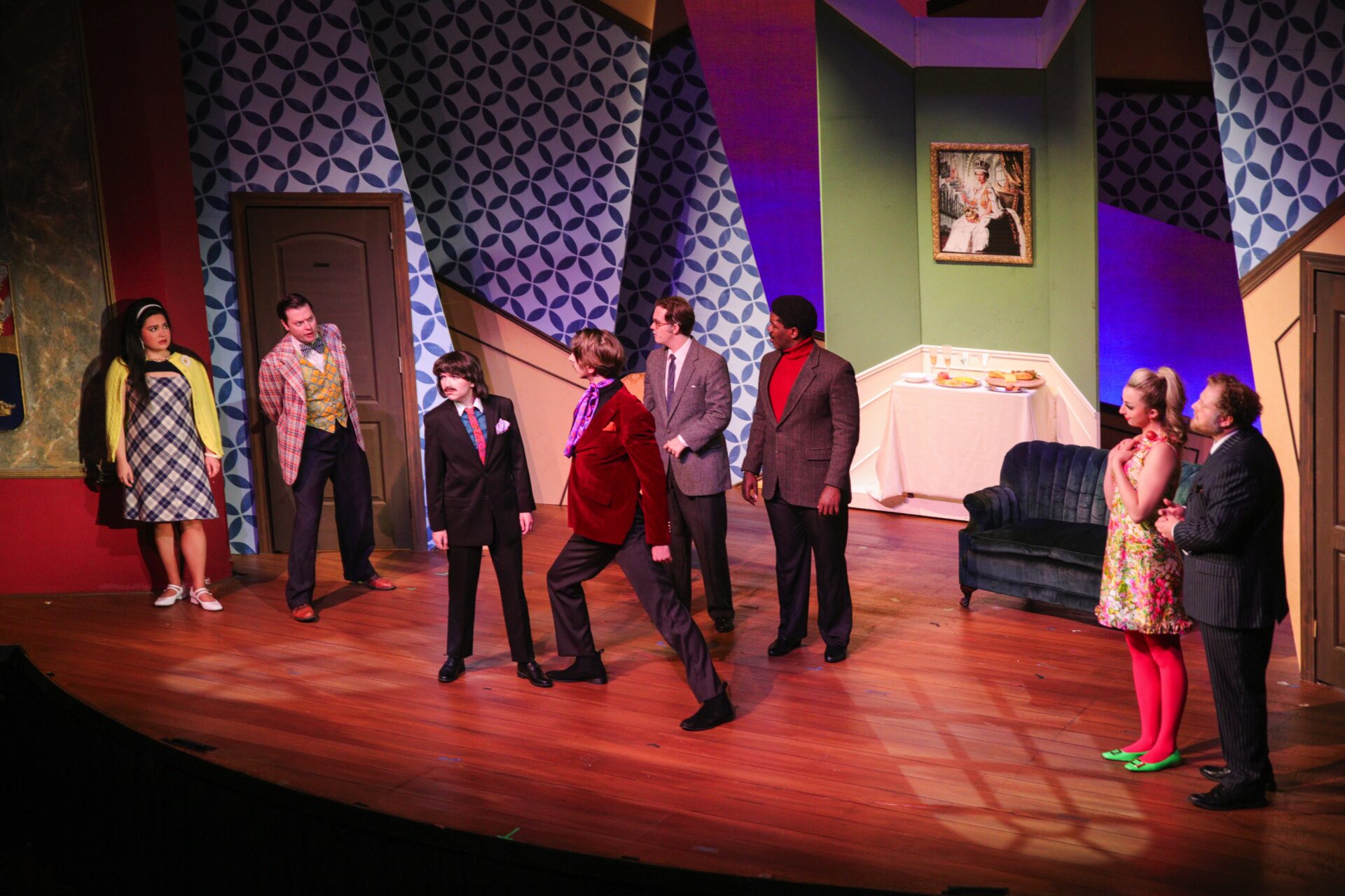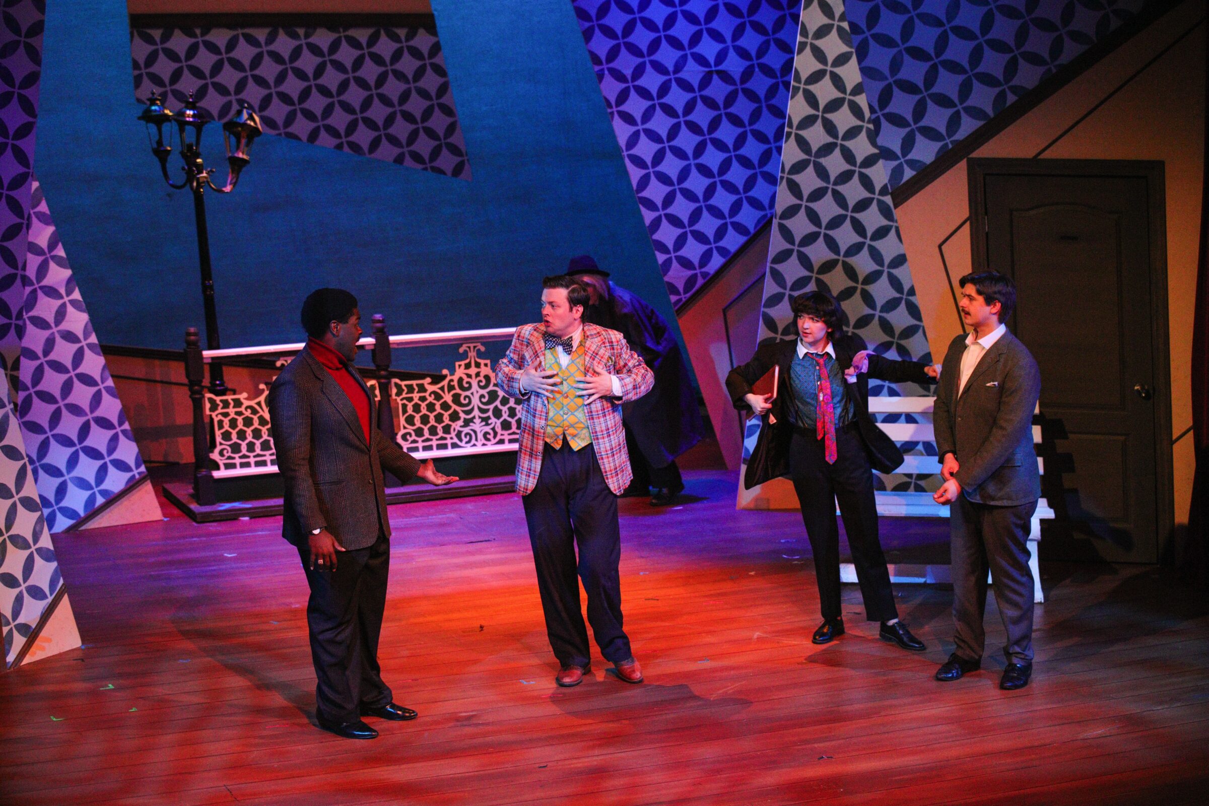 A fast moving comedy where Francis Henshall (Micheal Doherty) becomes simultaneously employed by two different men and has to ensure that neither finds out about the other. The design for this show was made to keep the play moving and emphasize the slapstick comedy of moments. The other aspect of the design involved reinforcing a live band that played the scene transitions so that they could hear each other (even though they were on opposite sides of the stage) and could all be heard by the audience.